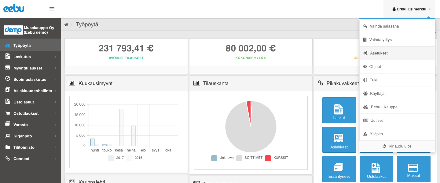 Alapuolella on kuva automaattisten kirjanpitotositteiden määrittämisestä, johon pääset ruudun oikeasta yläkulmasta painamalla asetukset-nappia ja valitsemalla aukeavasta ikkunasta Kirjanpito-välilehden. Voit siellä määritellä ruksaamalla mistä osiosta haluat tai et halua Eebun tekevän automaattisesti tositteita. Näitä osioita ovat Laskutus, Suoritukset, Ostolaskut ja Maskut. Kirjanpito-kohta, joka näkyy näissä samoissa asetuksissa, on sitä varten, että siihen voidaan merkitä käsin syötettävien tositteiden oletus tositelaji.